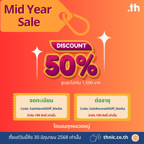จดทะเบียนโดเมนใหม่หรือต่ออายุโดเมนเดิม ลด 50% ทุกหมวดหมู่