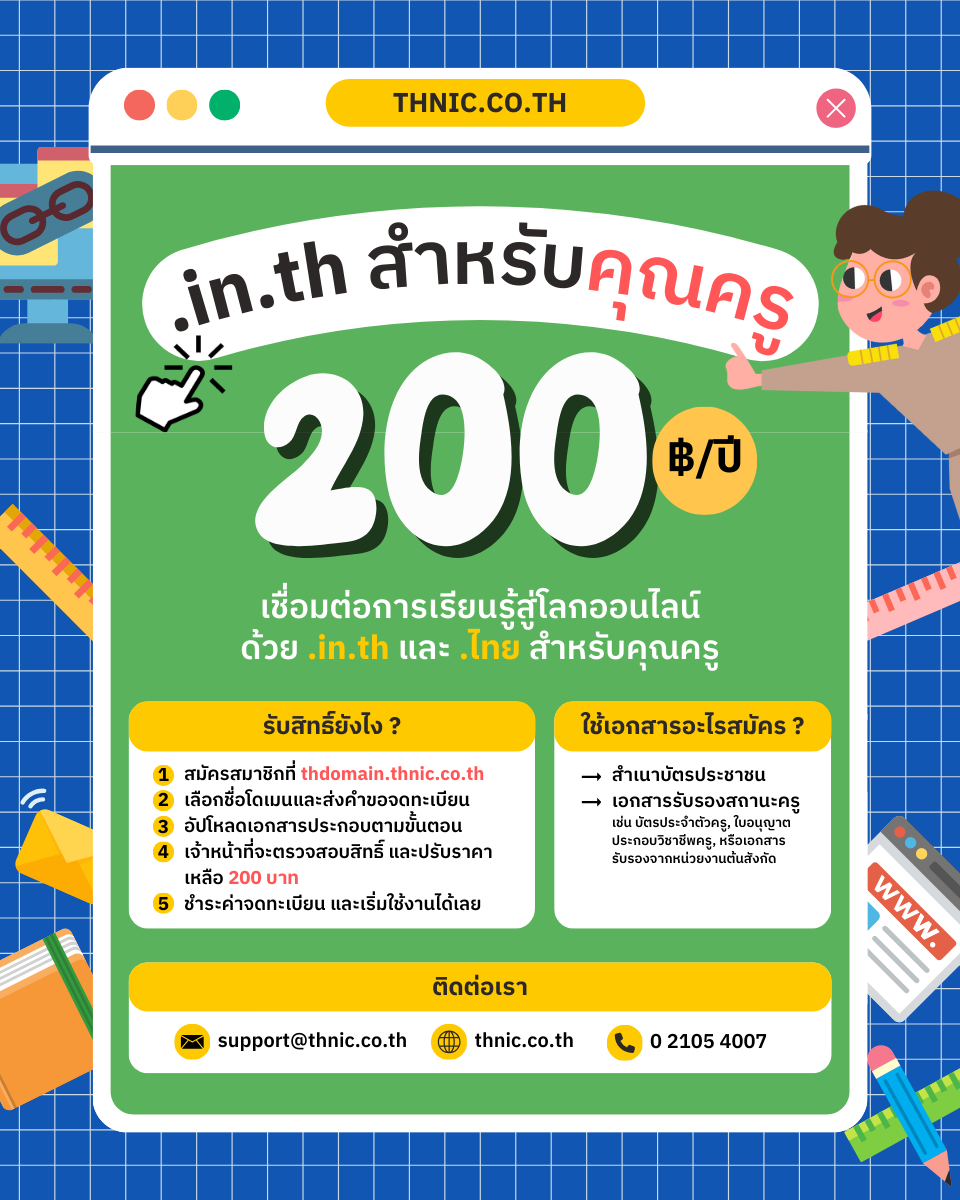 สิทธิพิเศษสำหรับคุณครู เมื่อจดทะเบียน หรือ ต่ออายุชื่อโดเมน .in.th
