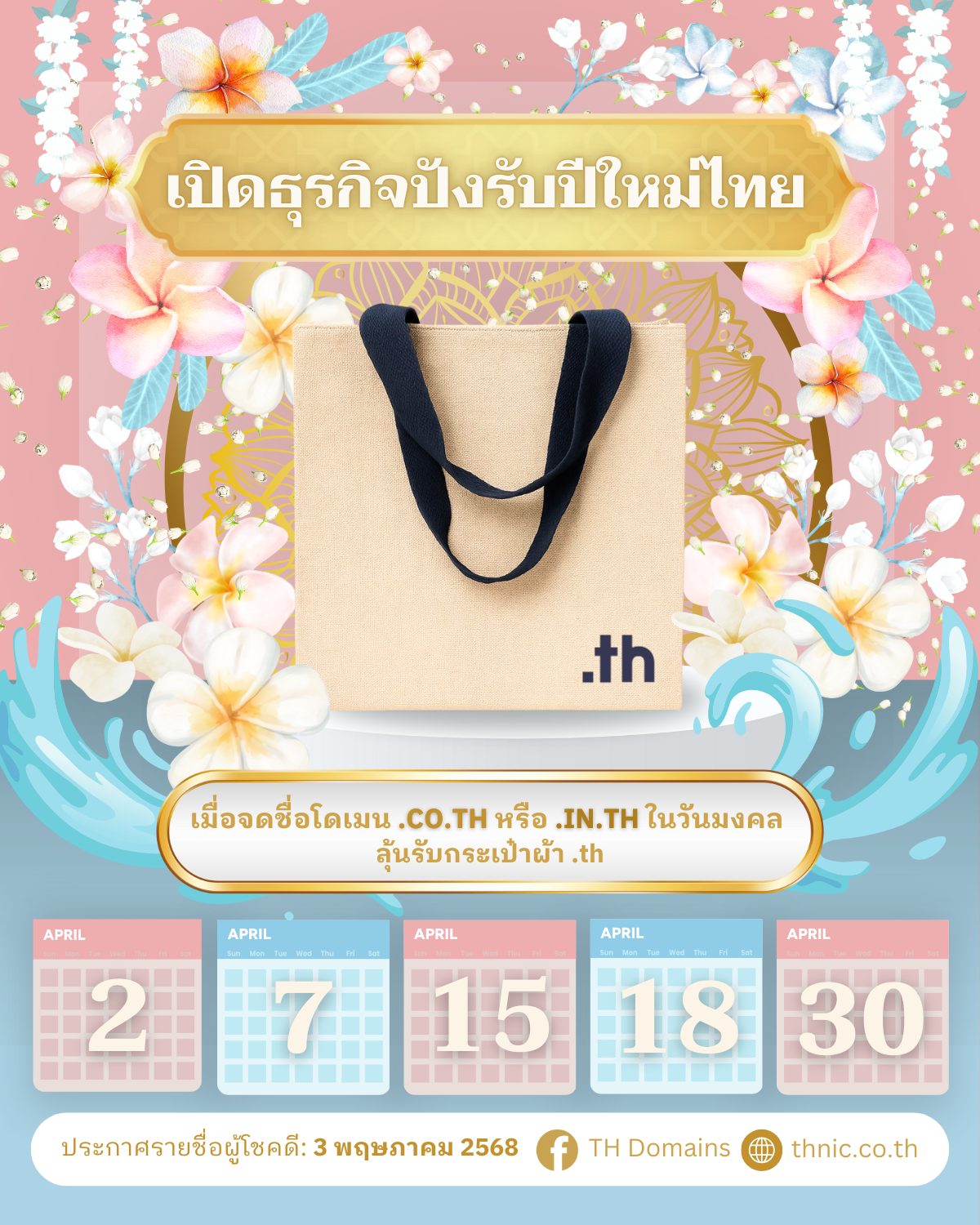 • สำหรับผู้ที่จดทะเบียนโดเมนใหม่หมวด .co.th หรือ .in.th ไม่จำกัดจำนวนปี และได้รับอนุมัติโดเมนในวันมงคลของเดือนเมษายนนี้เท่านั้น ได้แก่ วันที่ 2, 7, 15, 18 และ 30