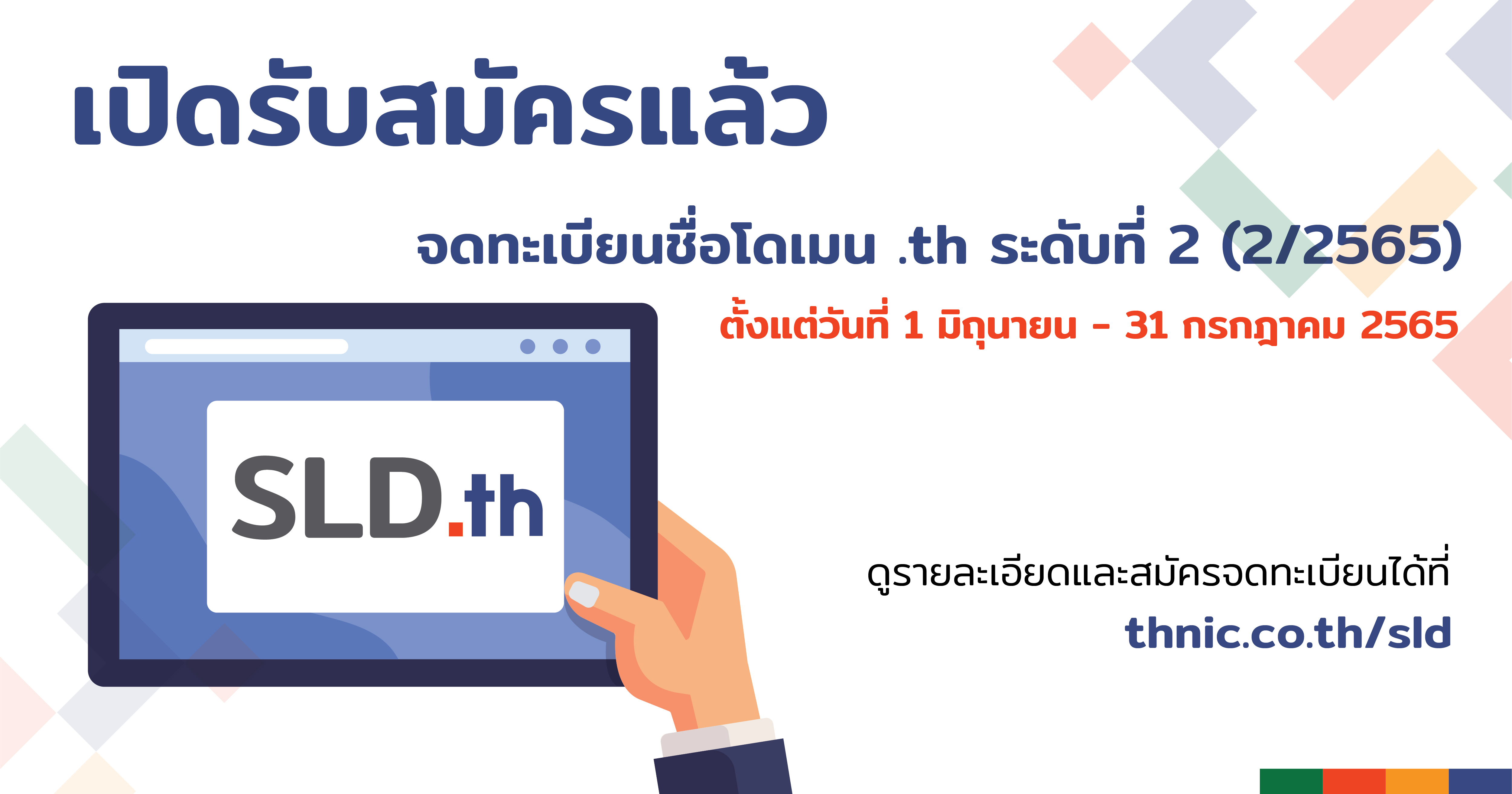 ผู้สนใจจดทะเบียนชื่อโดเมน .th SLD รอบที่ 2/2565 สามารถดูรายละเอียดได้ที่ https://thnic.co.th/sld หรือสอบถามข้อมูลเพิ่มเติมได้ที่อีเมล sld@thnic.co.th หรือ โทรศัพท์ 0 2105 4007